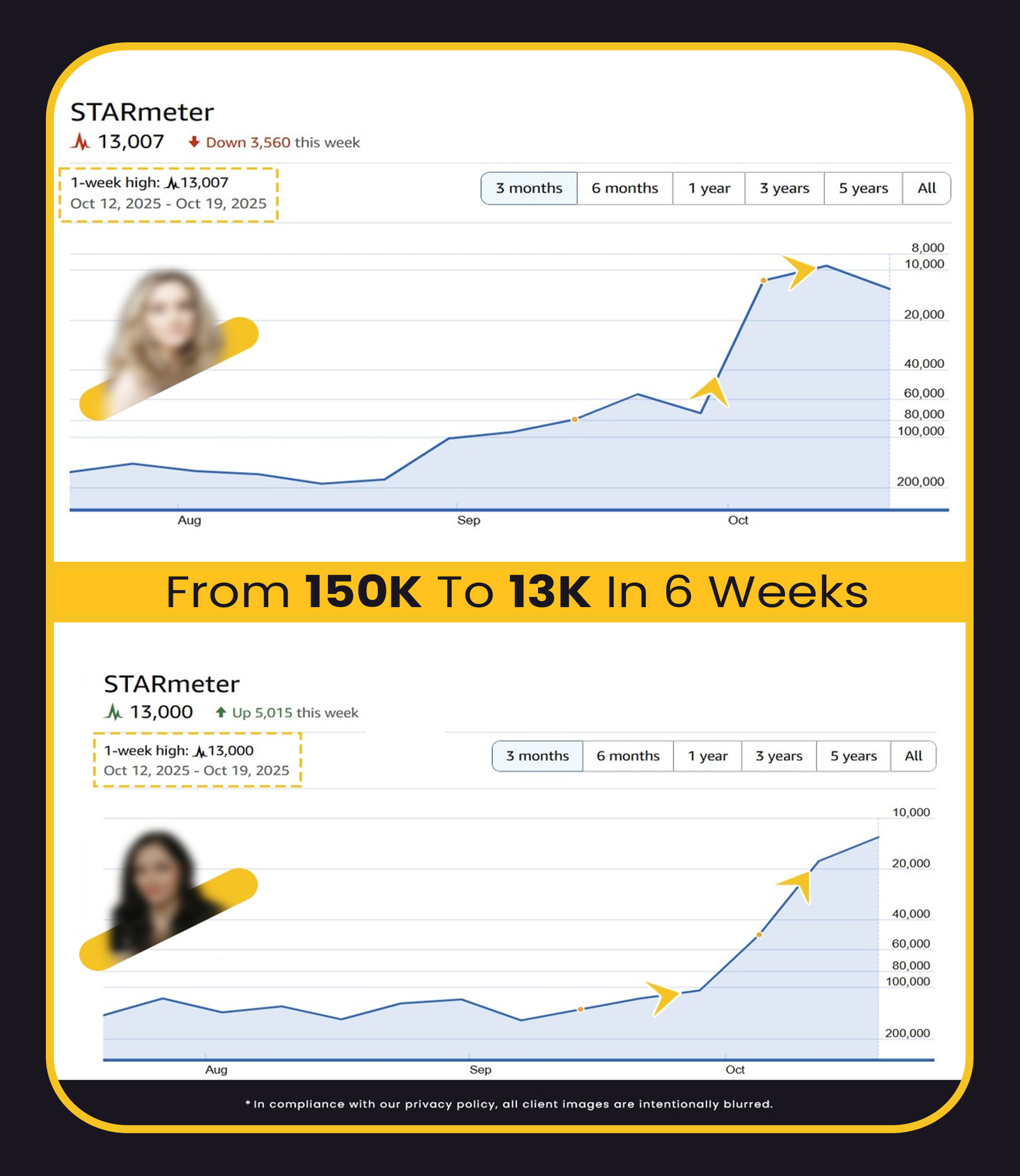 Our IMDb Rank Boost campaigns have helped hundreds of actors, producers, and agencies achieve higher STARmeter rankings and stronger industry visibility within weeks.