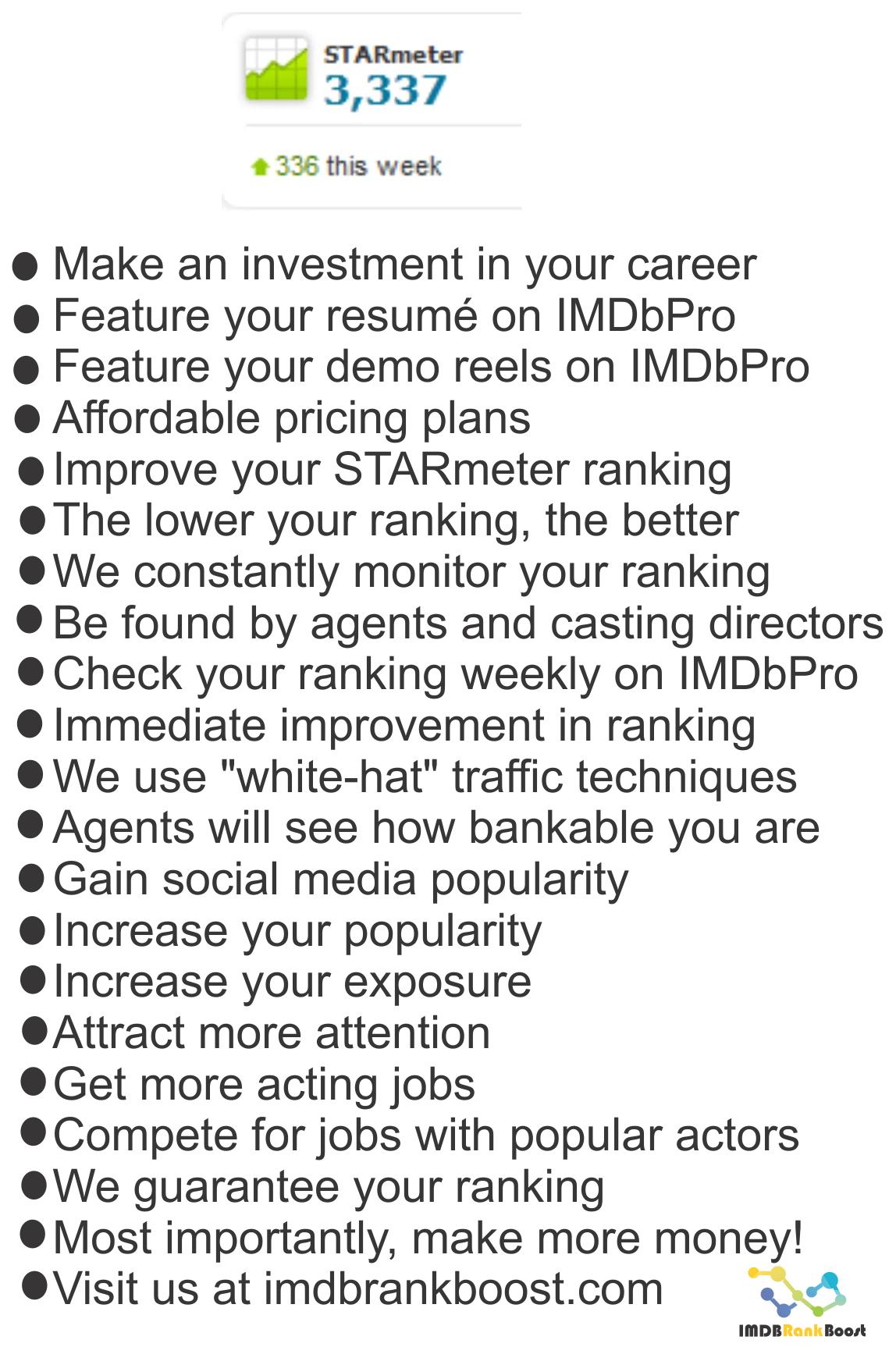 Our service helps actors and crew members achieve better rankings on IMDb. We start by getting views to your IMDb profile page (depending on the monthly package you select). Your IMDb page will also be socially bookmarked to increase search engine visibility. When your page gets more traffic, your STARmeter is boosted which will get you noticed by agents and casting directors.